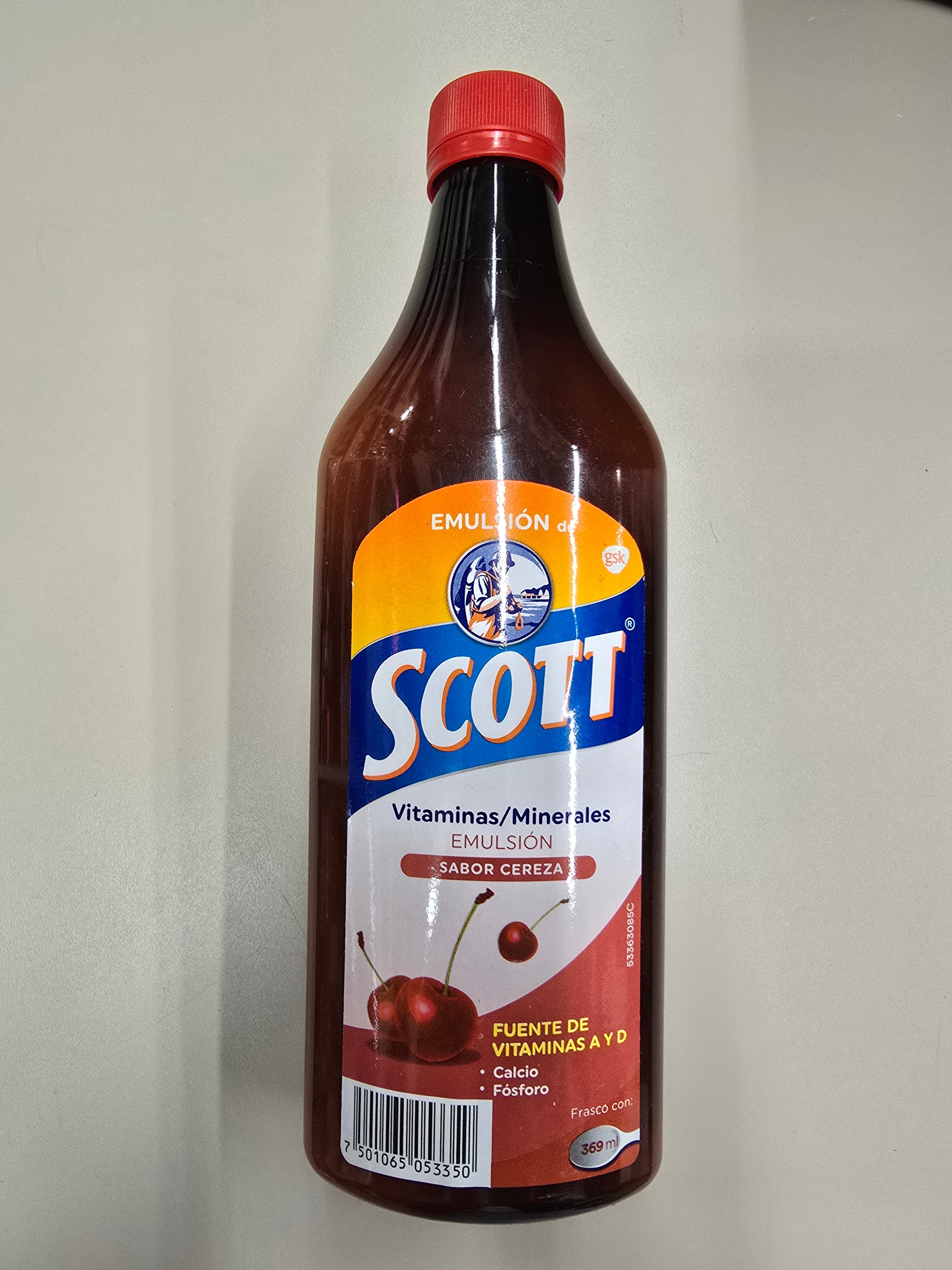 The image shows Scott's Emulsion, a cod liver oil supplement with cherry flavor.