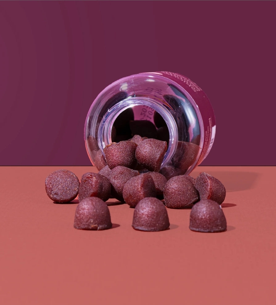 They are strawberry-flavored gummies containing fiber and prebiotics, which are beneficial for gut health and digestion. Prebiotics support the growth of healthy intestinal flora.
