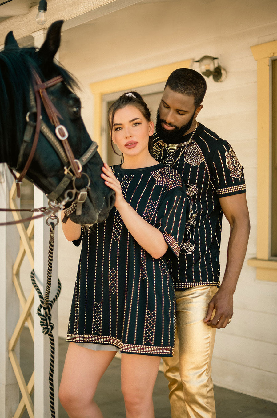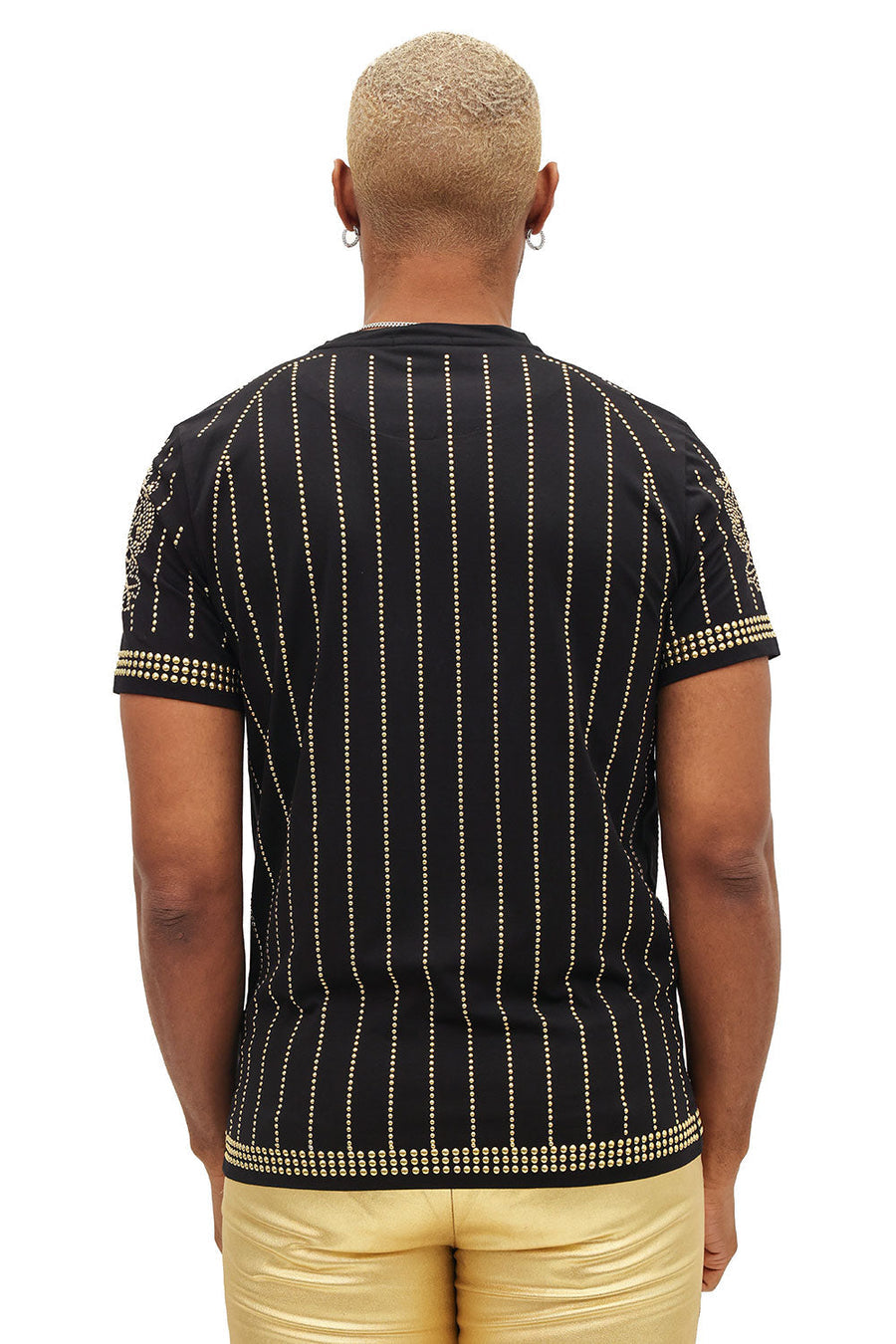 Men's rhinestone lion and striped design crew neck t-shirts take you from the party to the after-party with their fashion-forward styles. It has an original design and a combination of rhinestones and solid colors.